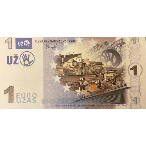 Leyenda del anverso 1 UŽ 1 EURO UŽAS UŽUPIO RESPUBLIKOS BARO BILIETAS PADENGTAS ALUMI (version from 2003 to 2018) UŽUPIO RESPUBLIKOS BANKO BILIETAS PADENGTAS PROGINĖMIS VERTYBĖMIS (version 2020)