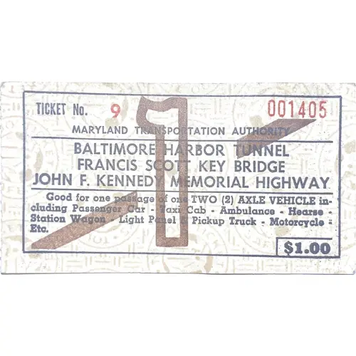 Ticket No. 2 [Serial Number] Maryland Trasportation Authority Batltimore Harbor Tunnel Francis Scott Key Bridge John F. Kennedy Memorial Highway Good for one passage of one Two (2) AXLE VEHICLE including Passenger Car - Taxi Cab - Ambulance - Hearse - Station Wagon - Light Panel & Pickup Truck - Motorcycle - Etc. $1.00 |
