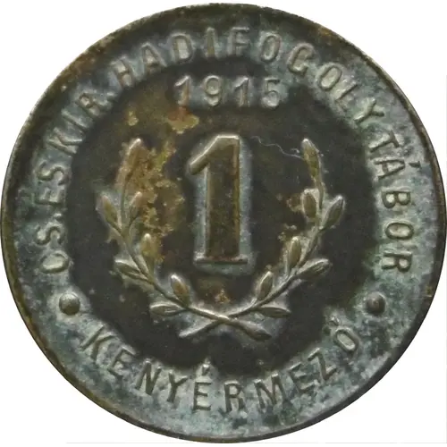 | Obverse lettering | CS. ÉS KIR. HADIFOGOLYTÁBOR 1915 1 ● KENYÉRMEZŐ ● (Translation: The Emperor and King`s Kenyérmező prisoners of war camp.) |