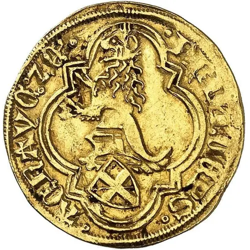 | Obverse description | Helmet with lion above arms, all within pointy trilobe. |