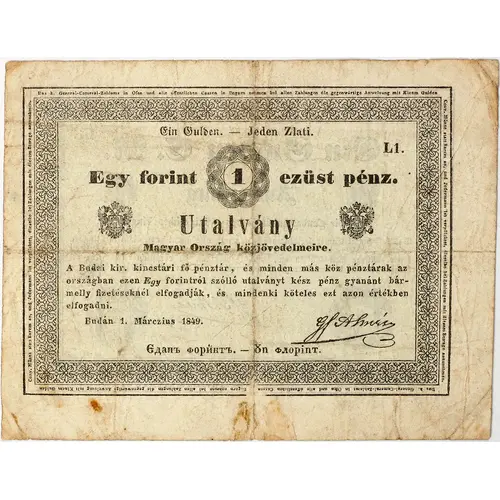 Egy forint (1) ezüst pénz Utalvány Magyar Ország közjövedelmeire Budán 1. márczius 1849. (Translation: 1 forint silver money Payment order for Hungary`s public income In Buda, on 1st of March, 1849) |