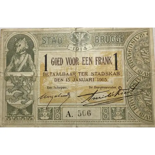 | 表面の銘文 | STAD BRUGGE . 1914 . 1 GOED VOOR EEN FRANK 1 BETAALBAAR TER STADSKAS DEN 15 JANUARI 1915. Een Schepen, De Burgemeester, RVM : BRVGENSIVM + RVM : BRVGENSIVM |