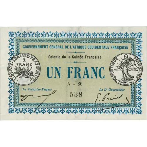 | Legenda del dritto | GOUVERNEMENT GÉNÉRAL DE L`AFRIQUE OCCIDENTALE FRANÇAISE COLONIE DE LA GUINÉE FRANÇAISE UN FRANC |