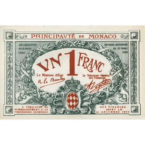 PRINCIPAUTÉ DE MONACO Délibération du 16 mars 1920 Décision souveraine du 20 mars 1920 UN 1 FRANC Le Ministre d’Etat R. le Bourdon Le Trésorier Général des Finances A.Noghès A PRÉSENTER AU REMBOURSEMENT A LA TRESORERIE GENERALE DES FINANCES AVANT LE 31 DÉCEMBRE 1922 |