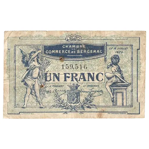 | Obverse lettering | chambre de commerce de BERGERAC 1 FRANC P. Jourdain DEL IMP. GIRAUDEL & SORBIER |