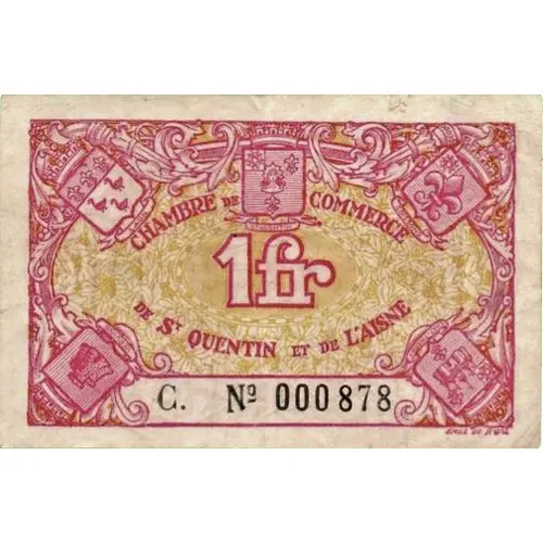 CHAMBRE DE COMMERCE DE ST QUENTIN ET DE L`AISNE 1 fr C. N°000878 VERVINS LAON SOISSONS CHAT-THIERRY EMILE DE RUAZ |