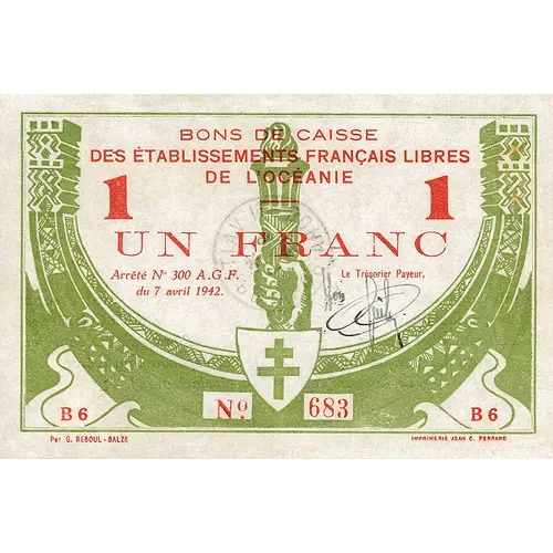 BON DE CAISSE DES ÉTABLISSEMENTS FRANÇAIS LIBRES DE L`OCEANIE UN FRANC Arrêté Nº 300 A.G.F. du 7 avril 1942. PAR G. REBOUL-SALZE IMPRIMERIE JEAN C. FERRAND (Translation: Voucher of the French Free Establishments of Oceania One Franc Law no. 300 A.G.F. April 7, 1942.) |