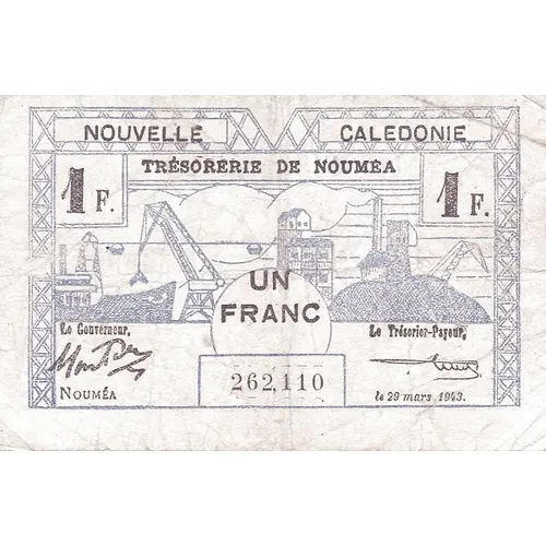 Nouvelle Caledonie Tresorerie de Noumea Un Franc (Translation: New Caledonia Treasury of Noumea One Franc) |