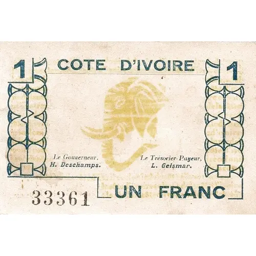 | Obverse lettering | COTE D`IVOIRE UN FRANC (Translation: IVORY COAST ONE FRANC) |