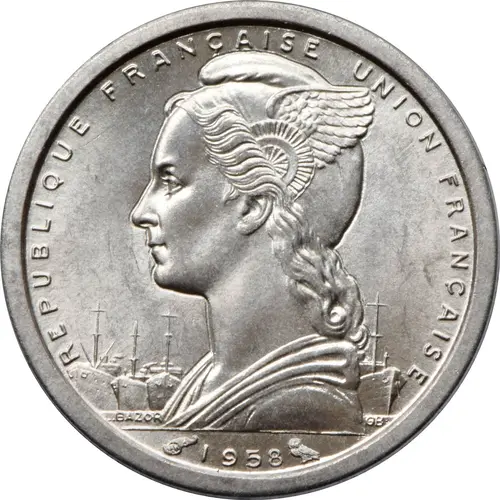 | Obverse lettering | REPUBLIQUE FRANÇAISE UNION FRANÇAISE L.BAZOR G.B. 1958 (Translation: French Republic French Union 1958) |