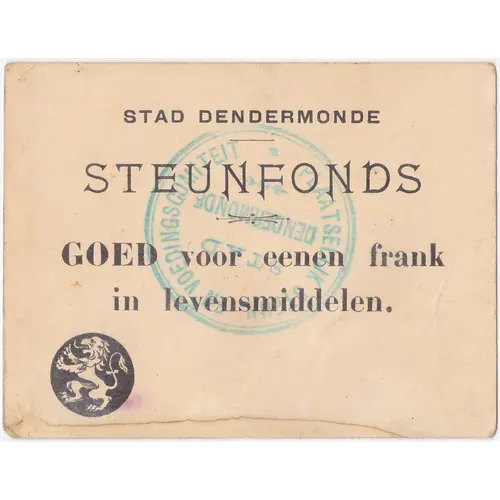 Obverse lettering STAD DENDERMONDE STEUNFONDS GOED voor eenen frank in levensmiddelen.