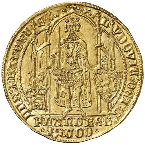 | Obverse description | Count Louis standing in a gothic archway, holding sword in his right hand, and resting his left on a shield with Flanders arms. To the left, a tournament helmet. Legend runs through bottom line in exergue |