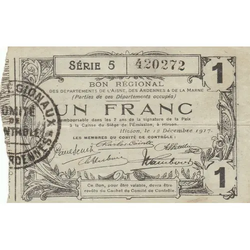 | Obverse lettering | Série 5 - 420272 Bon Régional des Départements de l`Aisne des Ardennes & de la Marne (partie de ces départements occupés) UN FRANC Remboursable dans les 2 ans de la signature de la Paix à la Caisse du Siède de l`Emission, à Hirson. Hirson, le 12 décembre 1917. Les Membres du Comité de Contrôle Ce Bon, pour être valable, devra être revêtu du Cachet du Comité de Contrôle |