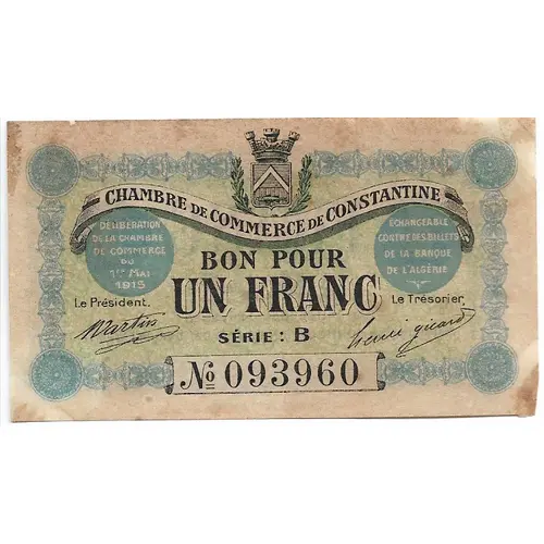 CHAMBRE DE COMMERCE DE CONSTANTINE BON POUR UN FRANC SERIE B Le Président Le Trésorier |