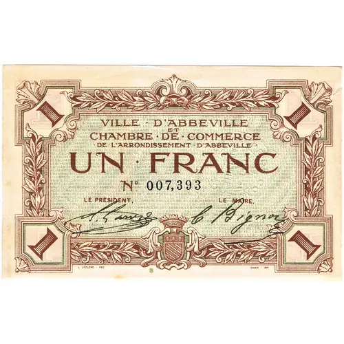 1 | 1 VILLE D`ABBEVILLE ET CHAMBRE DE COMMERCE DE L`ARRONDISSEMENT D`ABBEVILLE UN FRANC N° 007,393 Le Président Le Maire 1 | 1 L.LECLERC FEC CHAIX - IMP |
