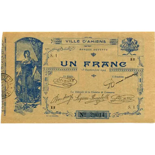 Obverse lettering VILLE D`AMIENS BANQUE DUVETTE UN FRANC 15 Septembre 1914 Les Délégués de la Chambre de Commerce IMP. DU PROGRÉS.