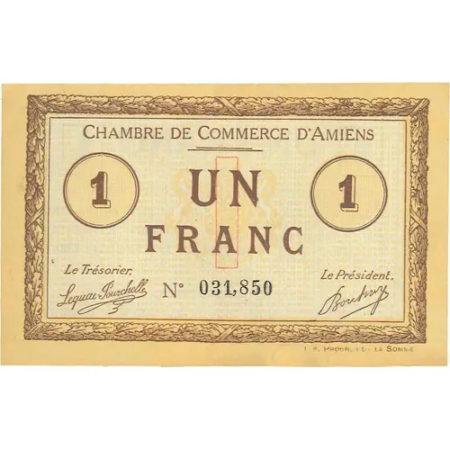 | Reverse lettering | 1 | UN FRANC | 1 Émission garantie par un dépôt d`égal somme à la Banque de France. Billet échangeable à vue, par somme d`au moins Cinq Franc, à la Banque DUVETTE à Amiens. Ce billet devra, sous peine de prescription, être présenté au remboursement avant le 5 Novembre 1920. Ce billet à cour dans la circonscription de la Chambre de Commerce d`Amien comprenant : AMIENS, DOULLENS, MONTDIDIER |