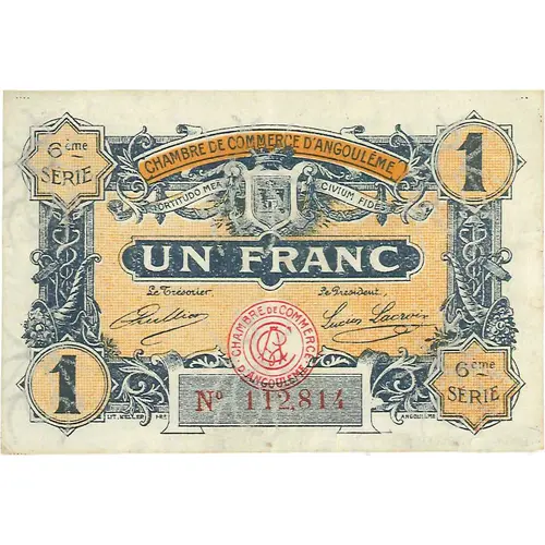 6ème série | 1 CHAMBRE DE COMMERCE D`ANGOULEME UN FRANC 1 | 6me série IMP. KELLER FRÈRE, ANGOULÊME |
