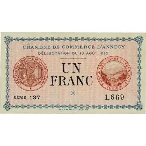 CHAMBRE DE COMMERCE D`ANNECY DELIBERATION DU 13 AOUT 1915 UN FRANC SERIE 137 1,669 IMP. B.ARNAUD _ LYON _ PARIS |