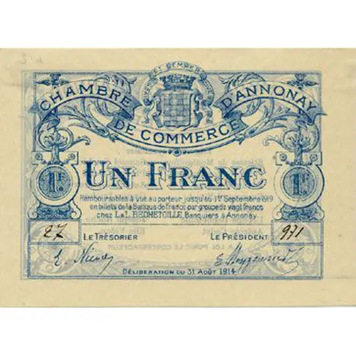 CHAMBRE DE COMMERCE D`ANNONAY 1F | UN FRANC | 1F Remboursable à vue au porteur jusqu`au 1er Septembre 1919 en billets de la Banque de France par groupe de vingt francs chez L&I BECHETOILE, banquier à Annonay. |