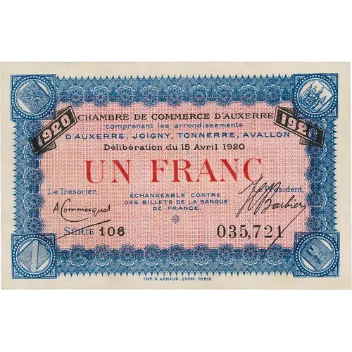| Obverse lettering | 1920 | 1920 CHAMBRE DE COMMERCE D`AUXERRE comprenant les arrondissements D`AUVERRE, JOIGNY, TONNERRE, AVALON Délibération du 08 Janvier 1920 UN FRANC Le Trésorier ECHANGEABLE CONTRE DES BILLETS DE LA BANQUE DE FRANCE Le Président SERIE 119 033,240 IMP. B. ARNAUD - LYON - PARIS |