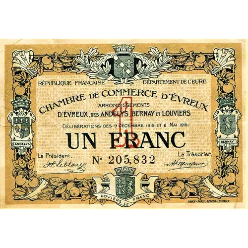 | Obverse lettering | REPUBLIQUE FRANCAISE DEPARTEMENT DE L`EURE CHAMBRE DE COMMERCE D`EVREUX Arrondissements d`EVREUX, des ANDELYS, Bernay et LOUVIERS Délibérations du 9 décembre 1915 et 6 mai 1916. UN FRANC Le Président Le Trésorier N° 205,832 NANCY-PARIS-BERGER_LEVRAULT. |