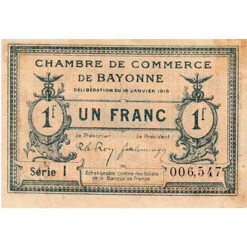 | Obverse description | Bayonne Chamber of Commerce Basses-Pyrénées department 1 franc Deliberation: January 16, 1915 Repayment deadline: March 1, 1920 Without printer`s name Type a : Series A to J (issued January 16, 1915) Number with 6 digits Signatures: THE TREASURER - THE PRESIDENT No watermark |