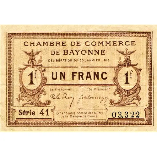 | Obverse lettering | CHAMBRE DE COMMERCE DE BAYONNE DELIBERATION DU 30 JANVIER 1918 UN FRANC Le Trésorier Le Président Série 41 03,322 Echangeable contre des billets de la Banque de France |