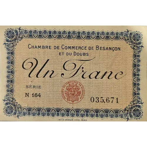 | Obverse lettering | Chambre de Commerce de Besancon et du Doubs 1 Franc Série N 164 .MP B ARNAUD_LYON.PARIS |