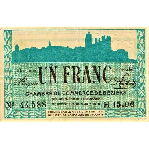 | Obverse lettering | UN FRANC CHAMBRE DE COMMERCE DE BEZIERS DELIBERATION DE LA CHAMBRE DE COMMERCE DU 9 JUIN 1915 N° 44,588 H15.06 Echangeable à vue contre des billets de la Banque de France |