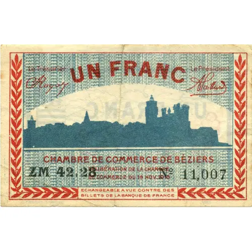 UN FRANC Le trésorier Le président CHAMBRE DE COMMERCE DE BEZIERS DELIBERATION DE LA CHAMBRE DE COMMERCE DU 19 NOV. 1918 ÉCHANGEABLE A VUE CONTRE DES BILLETS DE LA BANQUE DE FRANCE |