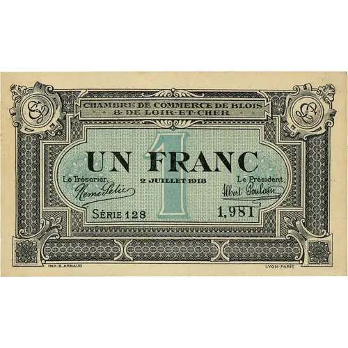 | Obverse lettering | CHAMBRE DE COMMERCE DE BLOIS & DU LOIR ET CHER UN FRANC Le Trésorier Le Président 2 JUILLET 1918 SERIE 128 1.981 IMP. B.ARNAUD LYON-PARIS |