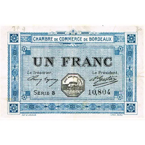 | Obverse lettering | CHAMBRE DE COMMERCE DE BORDEAUX UN FRANC Le Trésorier Le Président Série 3 10,804 IMP B.ARNAUD LYON_PARIS |