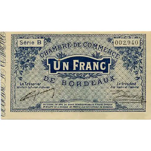 | Obverse lettering | Série B 002,940 CHAMBRE DE COMMERCE UN FRANC DE BORDEAUX Le Trésorier Membre de la Chambre de Commerce Le Président de la Chambre de Commerce ÉMISSION, EN 1914, DE BONS REMBOURSABLES À TOUTE ÉPOQUE, EN BILLETS DE LA BANQUE DE FRANCE, À LA SUCCURSALE DE BORDEAUX. |
