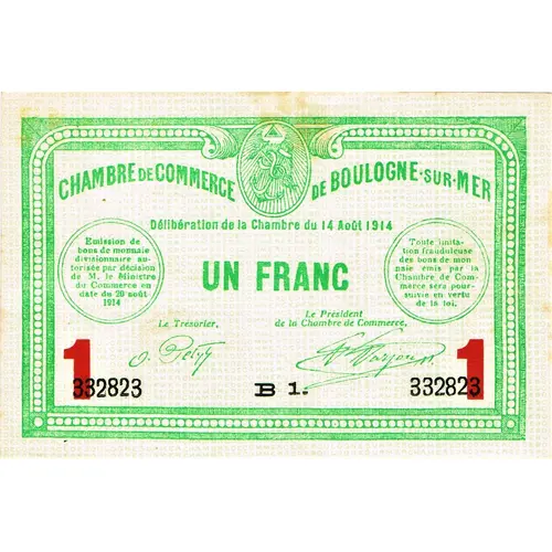 | Obverse lettering | CHAMBRE DE COMMERCE DE BOULOGNE-SUR-MER Délibération de la Chambre du 14 Août 1914 UN FRANC Le Trésorier .Le Président 332823 B 332823 |