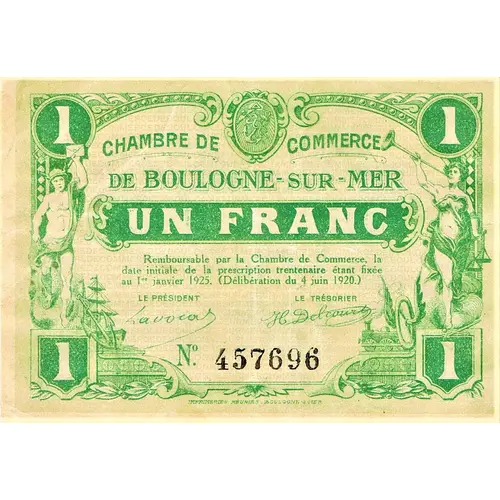 | Obverse lettering | CHAMBRE DE COMMERCE DE BOULOGNE-SUR-MER UN FRANC Remboursable par la Chambre de Commerce, la date initiale de la prescription trentenaire étant fixée au 1er janvier 1925. (Délibération du 4 juin 1920). Le Président Le Trésorier N° 457696 IMPRIMERIES RÉUNIES BOULOGNE-S-MER |