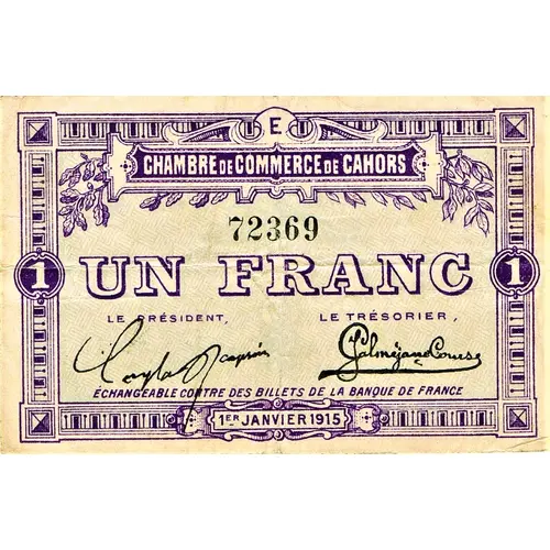 | Opis líce | E CHAMBRE DE COMMERCE DE CAHORS 72369 UN FRANC Le Président Le Trésorier Echangeable contre des billets de la Banque de France 1er JANVIER 1915 |