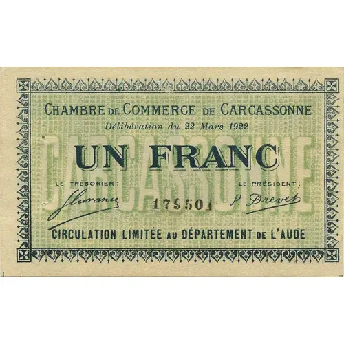 CHAMBRE DE COMMERCE DE CARCASSONNE Délibération du 22 Mars 1922 UN FRANC LE TRÉSORIER 179501 LE PRÉSIDENT CIRCULATION LIMITÉE AU DÉPARTEMENT DE L`AUDE |