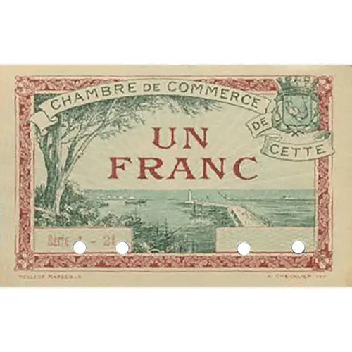 | Obverse lettering | CHAMBRE DE COMMERCE DE CETTE UN FRANC SERIE A - 25 03,018 MOULLOT MARSEILLE A. CHEVALIER INV. |