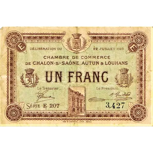 | Obverse lettering | Délibération du 22 juillet 1919 CHAMBRE DE COMMERCE DE CHALON-SUR-SAÔNE, AUTUN & LOUHANS UN FRANC Le Trésorier Le Président Série E 207 3,427 IMP. B.ARNAUD _ LYON_PARIS |