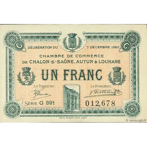 | Obverse lettering | DELIBERATION DU 7 DECEMBRE 1920 CHAMBRE DE COMMERCE DE CHALON-S/-SAÔNE, AUTUN & LOUHANS UN FRANC Le Trésorier Le Président Série G 391 012,678 IMP. B.ARNAUD LYON-PARIS |