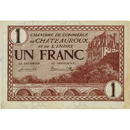 | Obverse lettering | CHAMBRE DE COMMERCE DE CHATEAUROUX et de L`INDRE UN FRANC Le Trésorier Le Président |