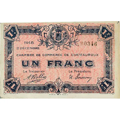 | Obverse lettering | 1F. 1918 2 DECEMBRE 00346 CHAMBRE DE COMMERCE DE CHATEAUROUX UN FRANC Le Trésorier Le Président IMP BADEL CHATEAUROUX |