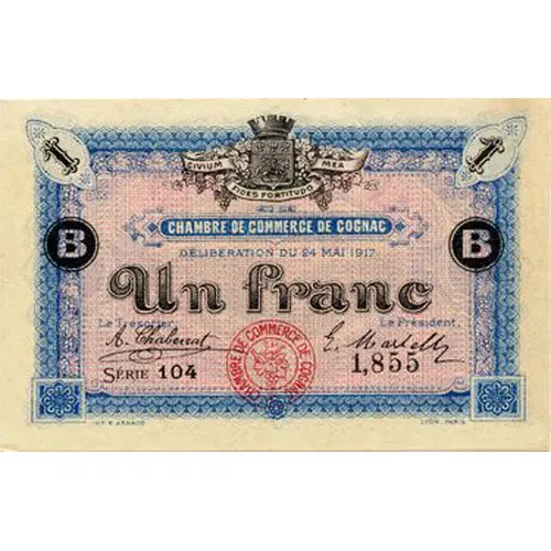 | Ön yüz lejandı | 1 CHAMBRE DE COMMERCE DE COGNAC DELIBERATION DU 24 MAI 1917 B Un Franc Le trésorier Le Président SÉRIE 104 1,855 IMP. B.ARNAUD LYON_PARIS |