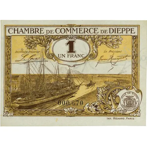 | Obverse lettering | CHAMBRE DE COMMERCE DE DIEPPE 1 UN FRANC Le Secrétaire Trésorier Le Président N°. 000,670 IMP. RICHARD, PARIS |