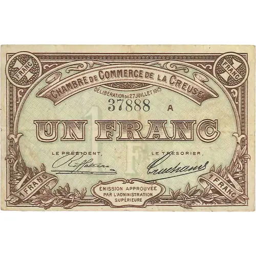 | Obverse lettering | CHAMBRE de COMMERCE de la CREUSE Délibération du 27 juillet 1915 37888 A UN FRANC Le Président - Le Trésorier Émission approuvée par l`administration supérieure |