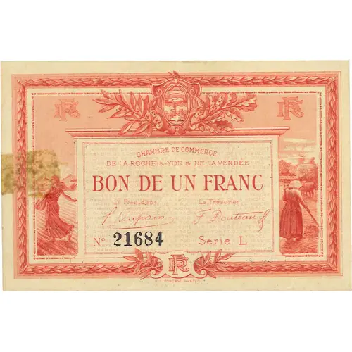 RF CHAMBRE DE COMMERCE DE LA ROCHE-s/-YON & DE LA VENDÉE BON DE UN FRANC Le Président Le Trésorier N° 21684 Série L RF IMP. MODERNE, NANTES |