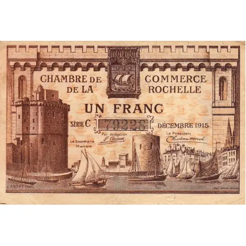 | Obverse description | CHAMBRE DE COMMERCE DE LA ROCHELLE UN FRANC SÉRIE C 79228 DÉCEMBRE 1915 LE SECRETAIRE MENBRE PAR DÉLÉGATION LE PRESIDENT L. ANDRE INV. IMP. PARÉ ANGERS |
