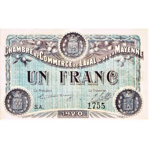 | Obverse lettering | CHAMBRE DE COMMERCE DE LAVAL & DE LA MAYENNE UN FRANC Le Président Le Trésorier S.A. 1755 1920 H. DALIBARD LAVAL |