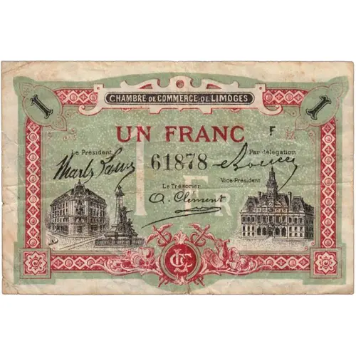 | Obverse lettering | 1 1 CHAMBRE DE COMMERCE DE LIMOGES UN FRANC F Le Président 61878 Par délégation Vice-Président Le Trésorier CCL IMP. P. DUMONT A LIMOGES |
